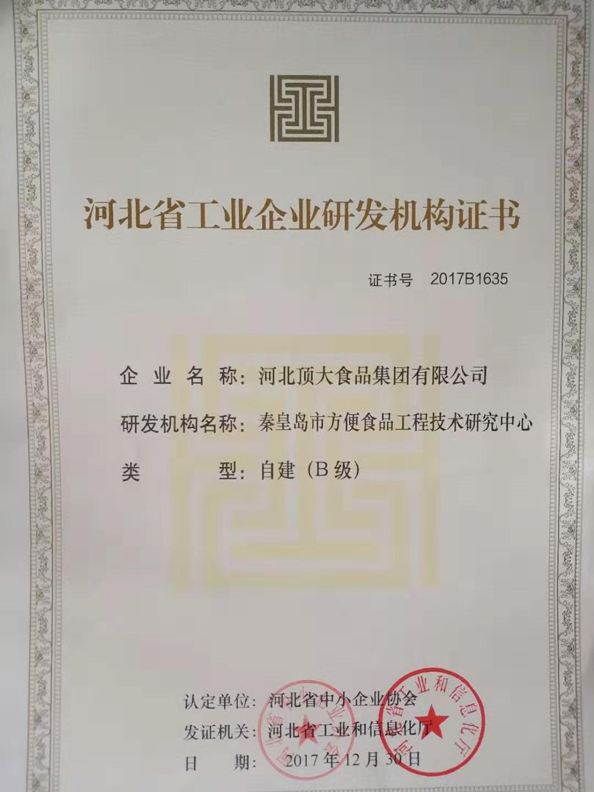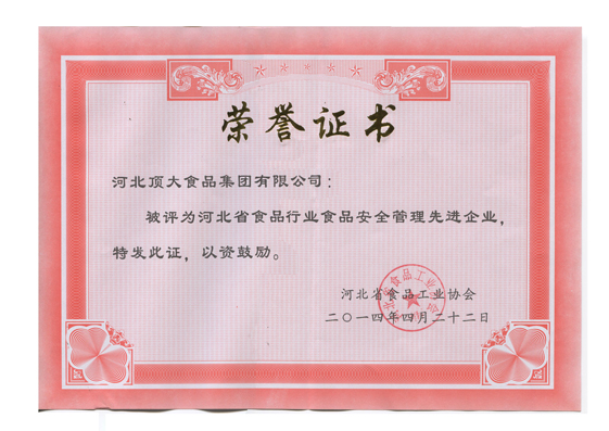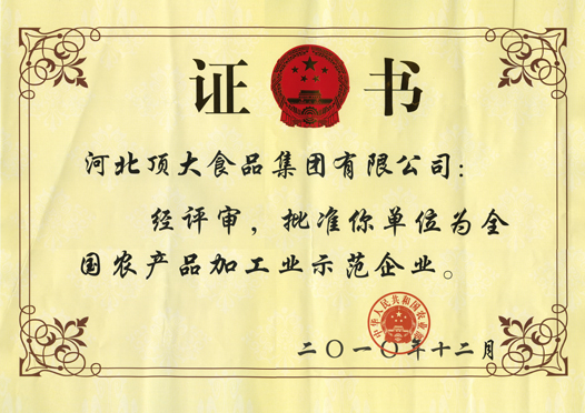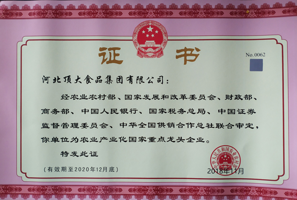 頂大集團連續(xù)多年被國家農(nóng)業(yè)部、發(fā)改委、財政部、商務部、人民銀行、國家稅務總局、國家證券監(jiān)委、供銷合作總社等八部委認定為“農(nóng)業(yè)產(chǎn)業(yè)化國家級重點龍頭企業(yè)”;近幾年,公司被評定為“全國食品工業(yè)科技進步優(yōu)秀企業(yè)”、“全省鄉(xiāng)鎮(zhèn)企業(yè)技術創(chuàng)新示范企業(yè)”、“河北省科技型中小企業(yè)”、“河北省食品安全先進企業(yè)”、“河北省科技小巨人企業(yè)”和“河北省工業(yè)企業(yè)研發(fā)機構”等榮譽稱號。